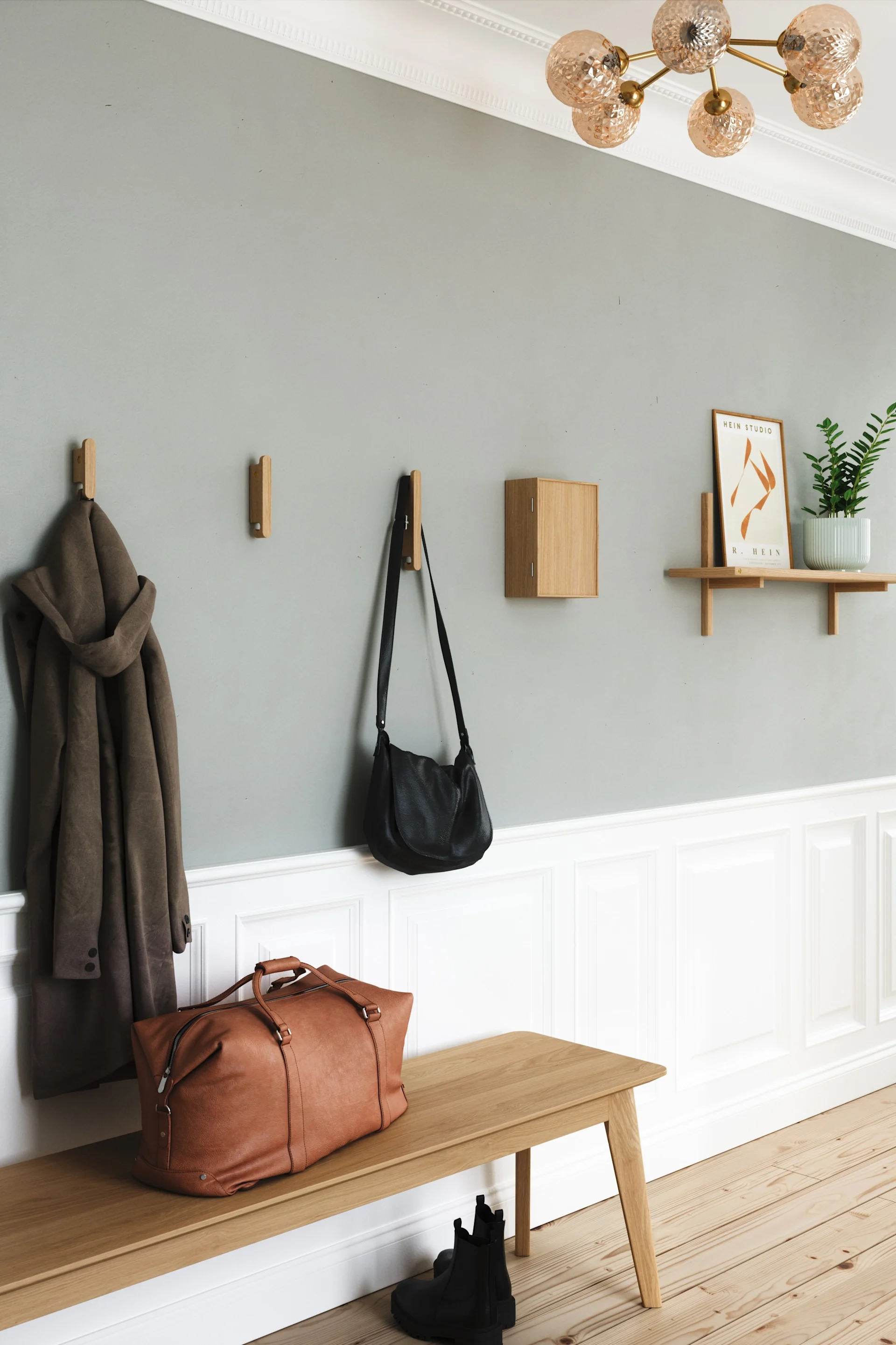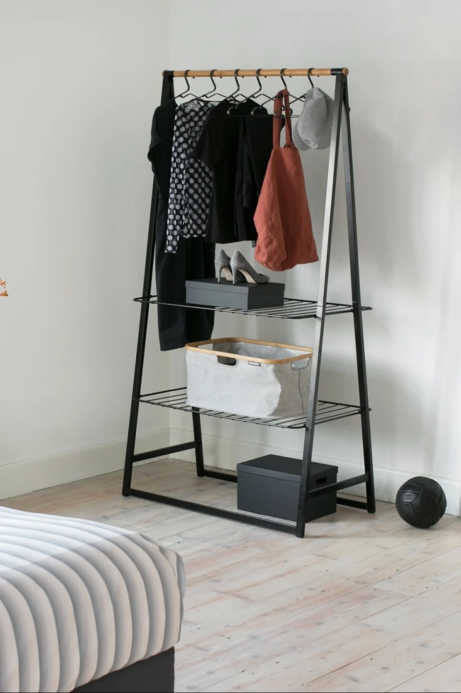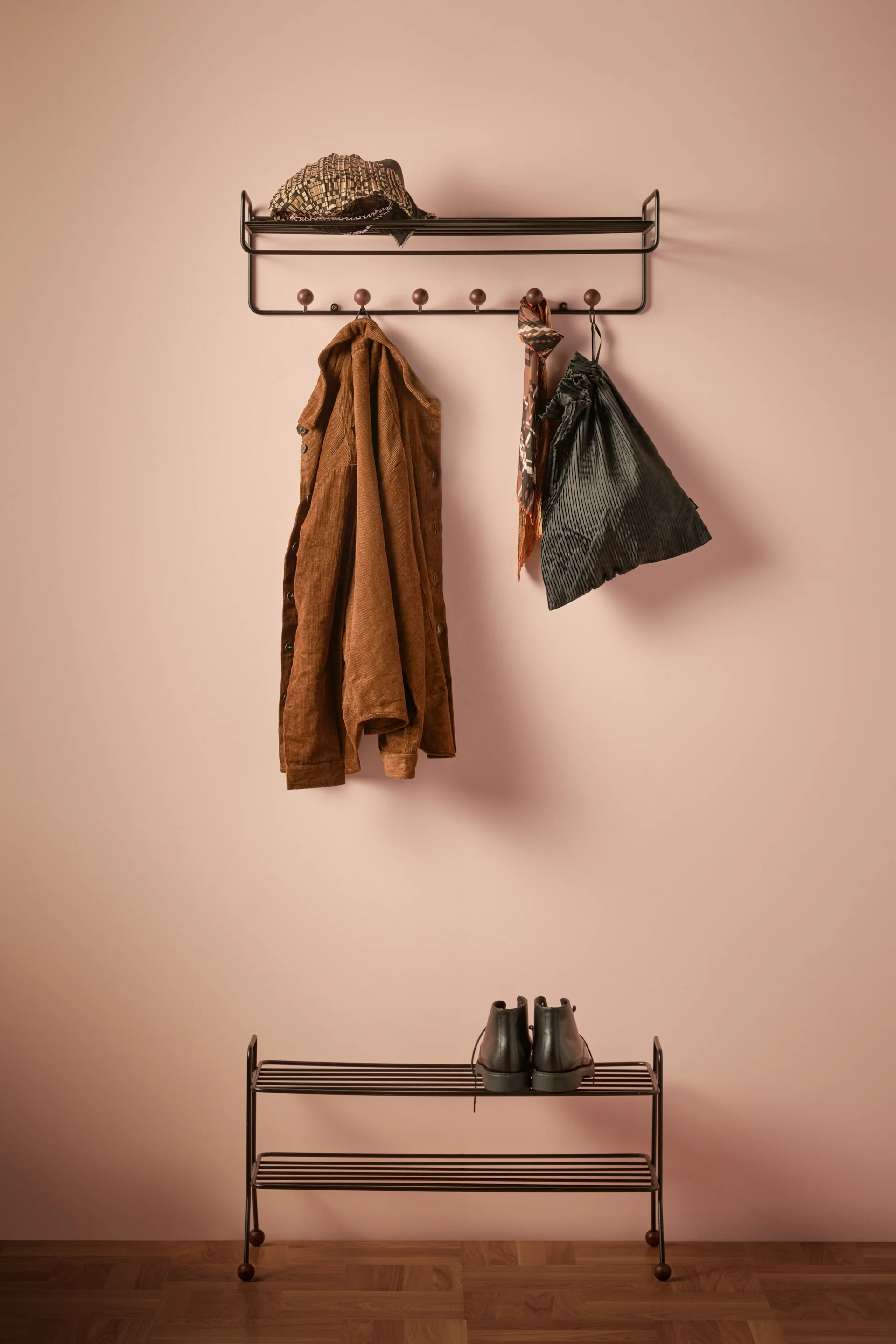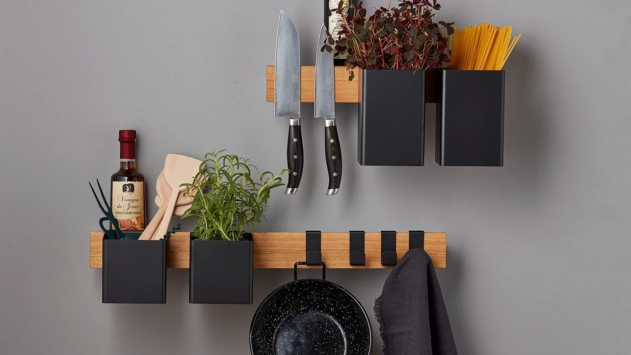 En habitaciones pequeñas, es importante aprovechar al máximo el espacio disponible. Estanterías de pared, ganchos o sistemas modulares como el Pythagoras de la marca Maze crean espacio de almacenamiento sin ocupar el espacio del suelo. Al mismo tiempo, se logra una solución estética y práctica para mantener el orden.