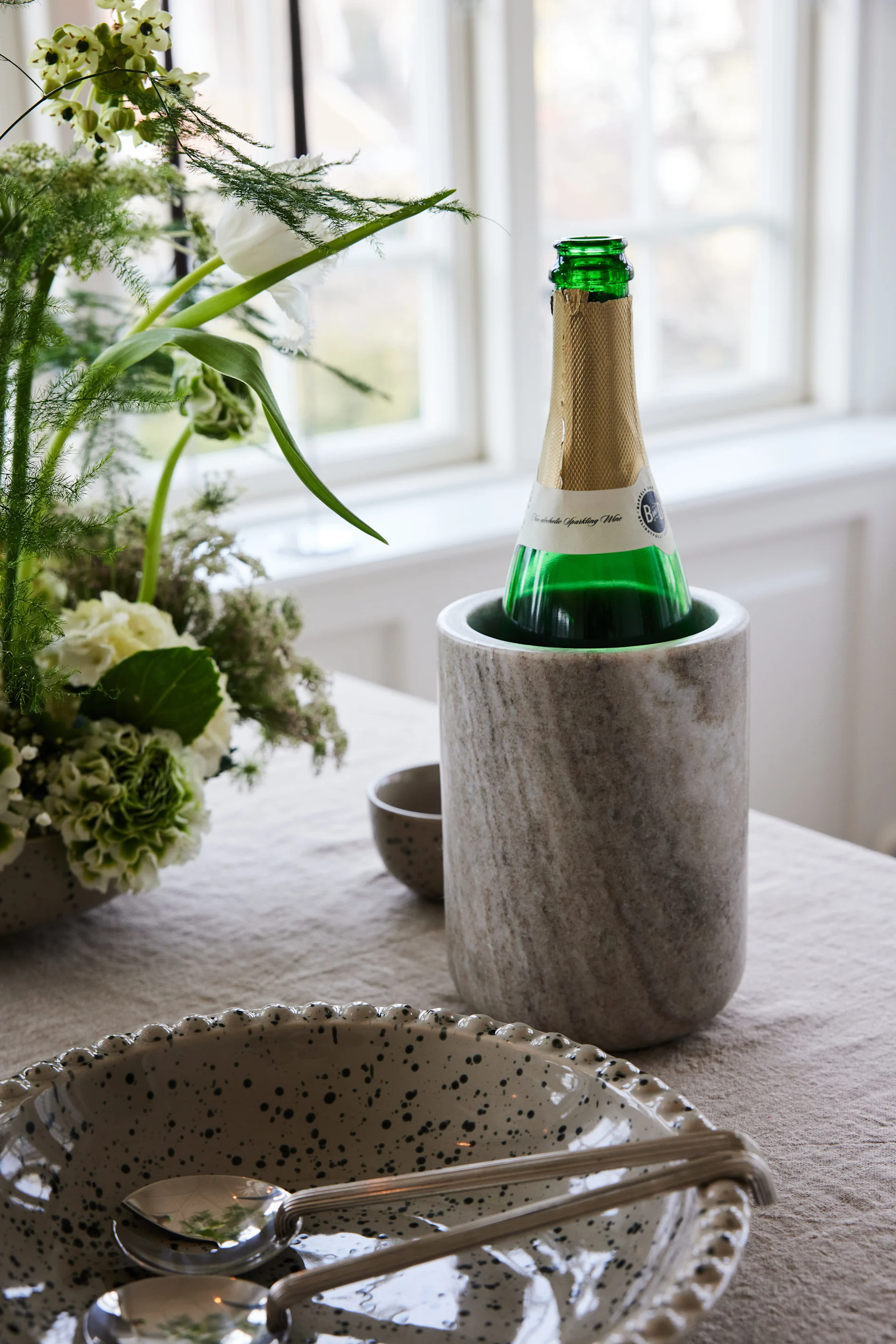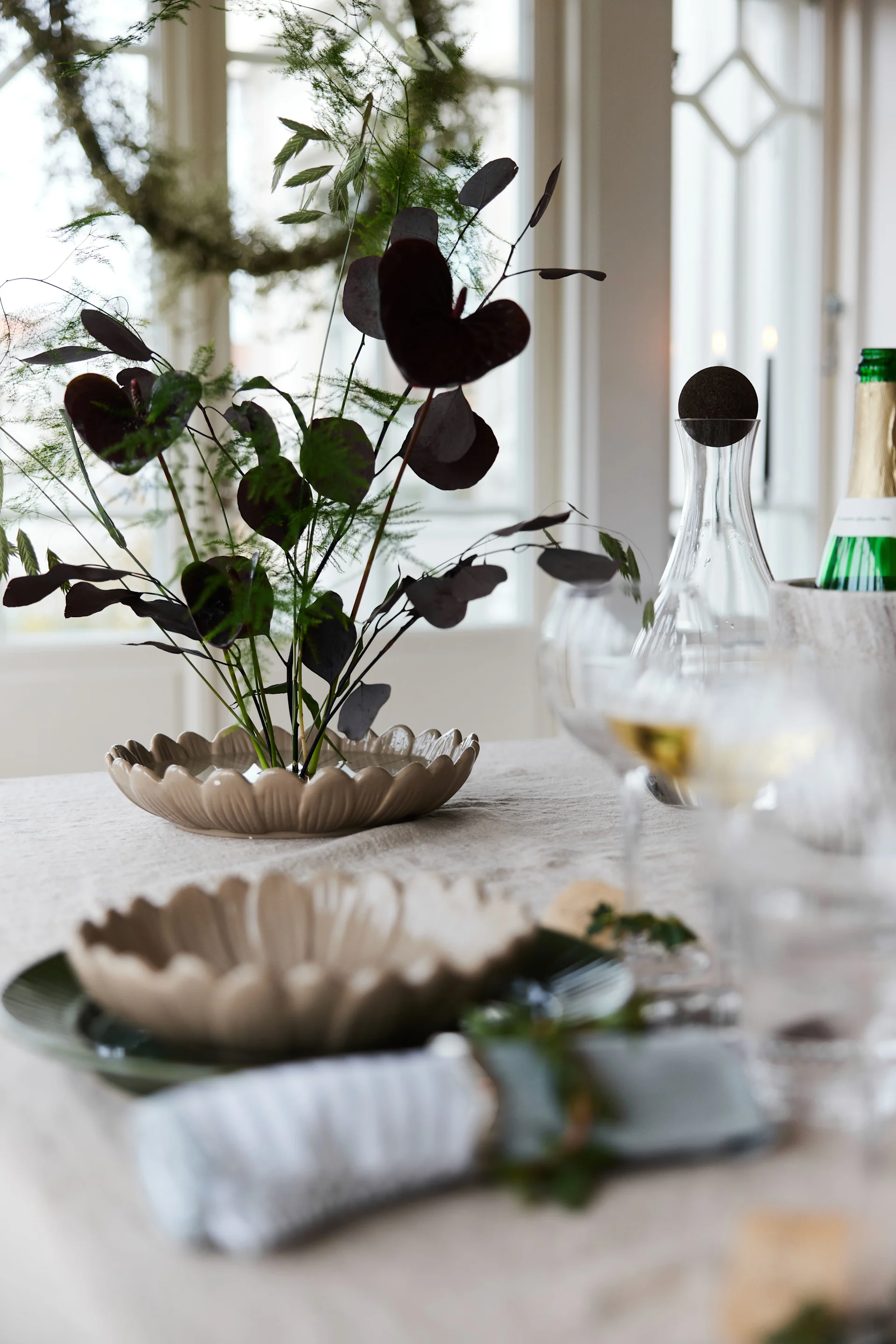 Una combinación de colores suaves, formas curvas y detalles sofisticados otorgan a esta decoración de mesa una ligereza moderna. La vajilla ondulada añade toques juguetones, mientras que los accesorios en tonos verdes proporcionan una paleta de color armónica. Los arreglos florales frescos aportan naturalidad y elegancia a la mesa, mientras que la luz de las velas crea una atmósfera acogedora y romántica. Perfecto para una cena estilosa con detalles llenos de cariño.