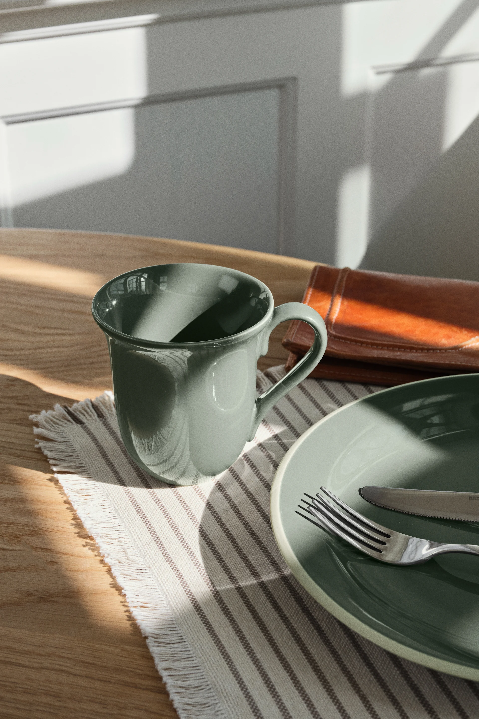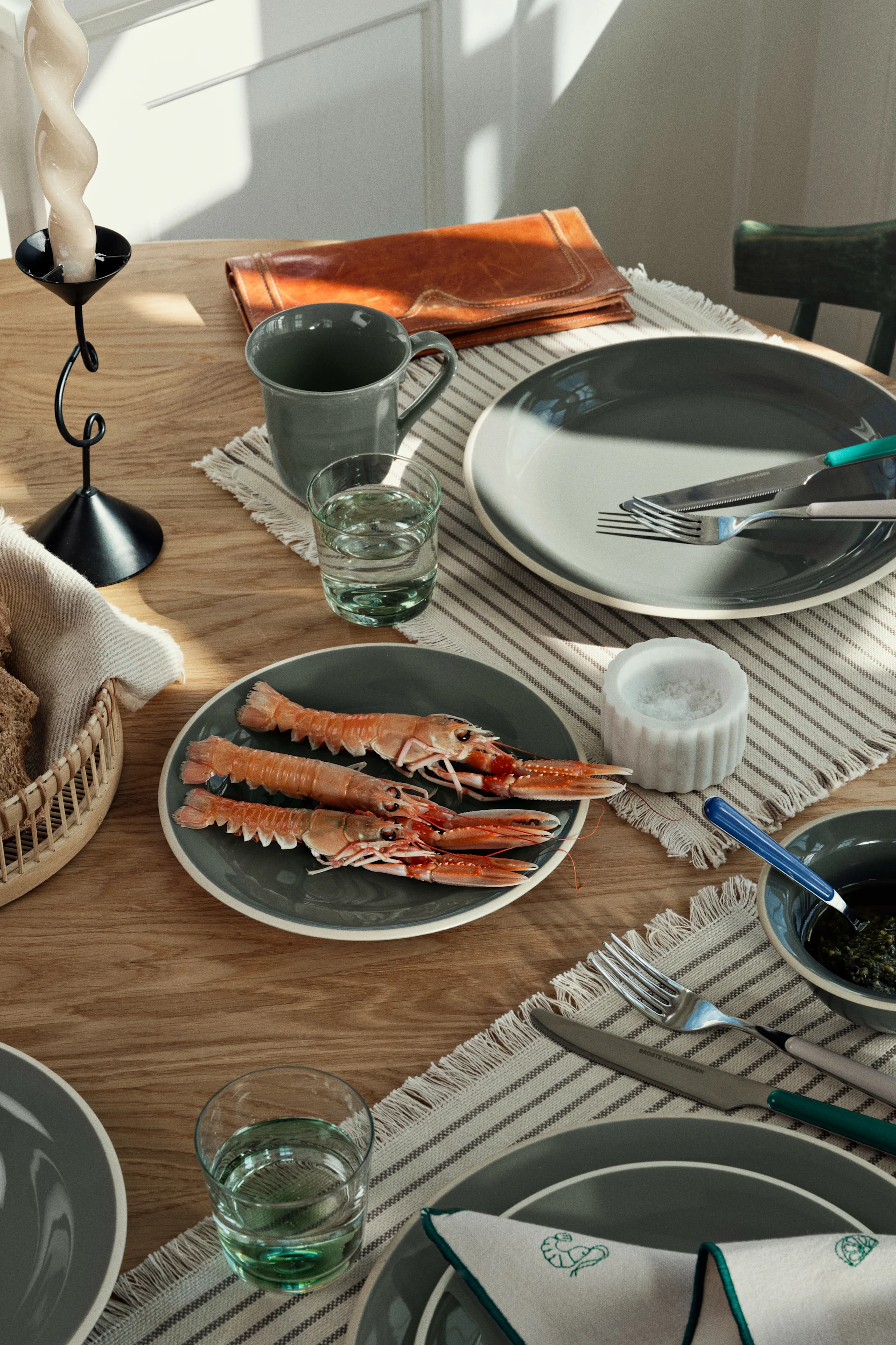 Añade un toque encantador de verde y un bonito marco a tu mesa festiva con porcelana en este precioso tono. Aquí tienes una mesa en un tono verde apagado con una vajilla de alto brillo que sirve tanto para el día a día como para las fiestas. Combínalo con manteles individuales estampados, cubiertos de colores y vasos sencillos para crear un ambiente de fiesta casual y relajado. Deja que diferentes piezas de la vajilla ocupen el centro de la mesa para darle un toque más imperfecto y un aspecto de bistró.