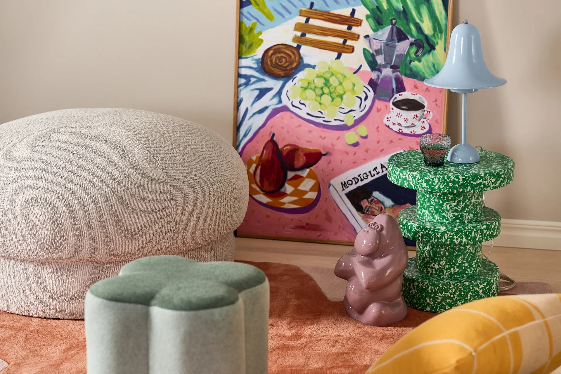 La paleta de colores de Unique Vibes es brillante y atrevida - naranja, fucsia, un verde inspirado en Nintendo, amarillo brillante, toques de lavanda y rojo, y pizcas de rosa polvo y azules que pasan a turquesa. Para mantener el aspecto y la sensación escandinavos, mantenemos nuestra base clara y fresca, pero incorporamos elementos coloridos que desafían nuestro interior.