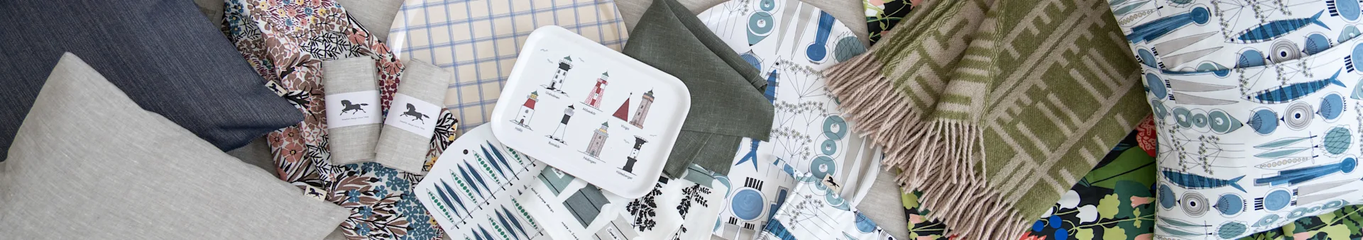 En su colección encontrarás preciosas y populares telas, manteles de hule, paños de cocina, servilletas, bandejas o tablas de cortar, con motivos florales, comidas campestres y arenques. Sus telas y artículos de decoración y diseño nórdico encajan tanto en ambientes tradicionales como modernos.