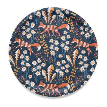 Bandeja Stjärnspeja Ø31 cm de Arvidssons Textil, fabricada en chapa de abedul con certificado FSC y un motivo floral diseñado por Hanna Werning. La bandeja redonda sirve tanto como base para servir como elemento decorativo en la cocina.