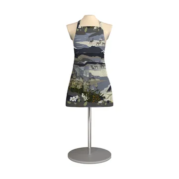 Delantal Fjällvandring de Arvidssons textil está confeccionado en algodón y cuenta con un práctico bolsillo en el pecho. El estampado, diseñado por Louise Videlyck, se inspira en las montañas del norte de Suecia. El delantal es apto tanto para la cocina como para el jardín y se ata fácilmente a la cintura.