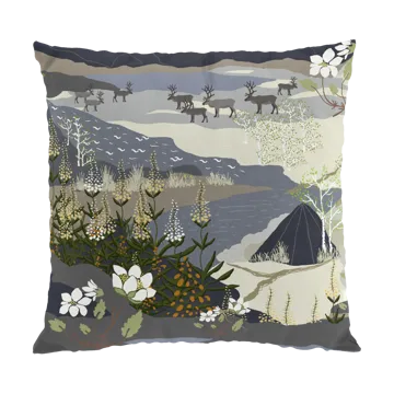 Funda de cojín Fjällvandring 47x47 cm de Arvidssons Textil presenta un bonito diseño inspirado en los paisajes montañosos, impreso sobre 100% algodón. Esta funda queda genial colocada, por ejemplo, en un taburete del recibidor o en el sofá del salón. El motivo, que incluye montañas, renos y flores, ha sido diseñado por Louise Videlyck.