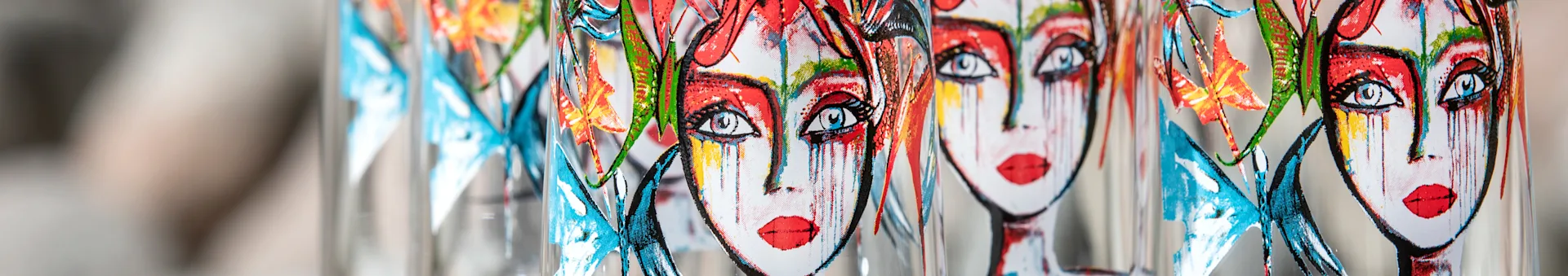Los vibrantes motivos en los vasos y la porcelana representan retratos femeninos. La inspiración para los motivos proviene de mujeres que ha conocido en su vida y de quienes siente que ha recibido inspiración y alegría.