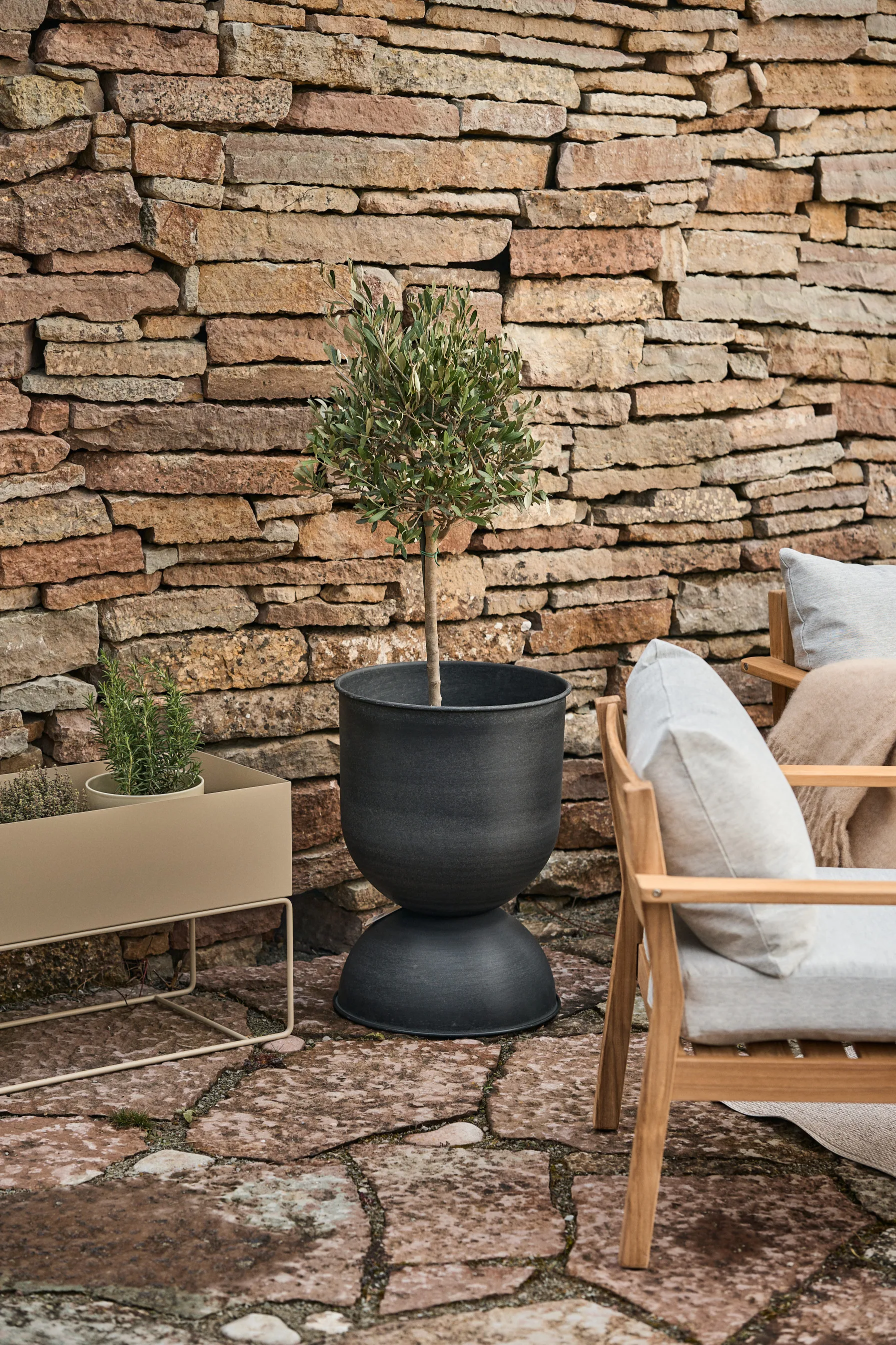 Maceta Hourglass grande Ø50 cm de Ferm Living es una llamativa maceta con forma de reloj de arena que eleva tus plantas del suelo y les ofrece un lugar bonito y elevado en el hogar. El diseño incluye dos cuencos reversibles que aportan flexibilidad de uso: úsalos como un pedestal alto o como un contenedor de plantación espacioso con suficiente espacio para las raíces. Fabricada en metal con acabado pulverizado mate y tratamiento específico de superficie que la hace resistente para terraza o balcón. Fácil de colocar en el salón, el recibidor o la zona exterior para lograr un fuerte impacto visual.