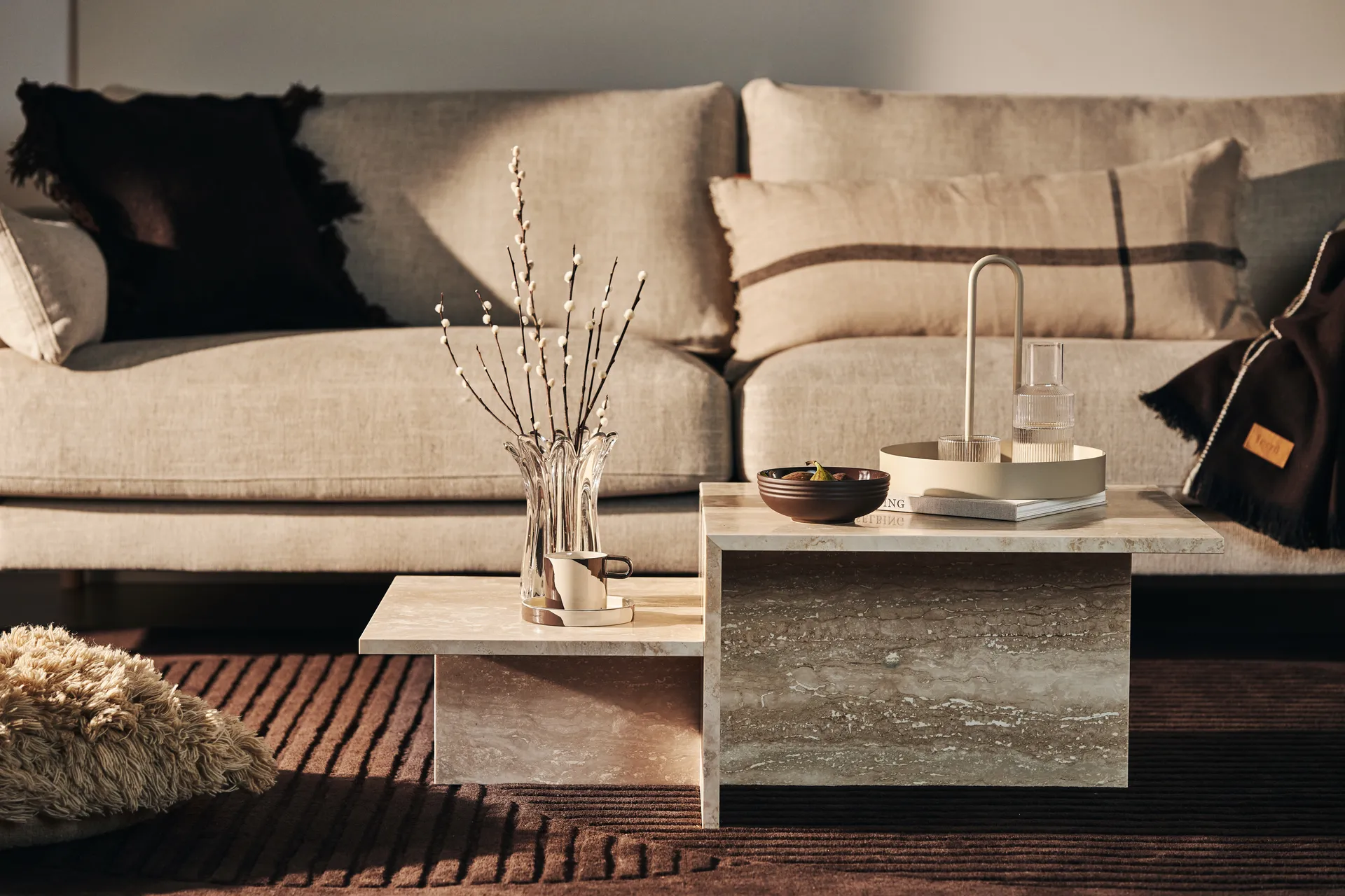 La taza Inlay con platillo de la danesa Ferm Living está hecha de gres con un patrón similar al mármol en dos colores que se ha creado mediante una mezcla de arcillas, lo que le da a cada pieza una apariencia completamente única. El brillante esmalte transparente proporciona una superficie suave y fina y ofrece un bonito contraste con el material robusto y el diseño de la taza con una pequeña asa en la parte superior. El gran platillo redondo tiene un borde alto que también lo hace perfecto para usar con el sándwich del desayuno o las galletas de la merienda.