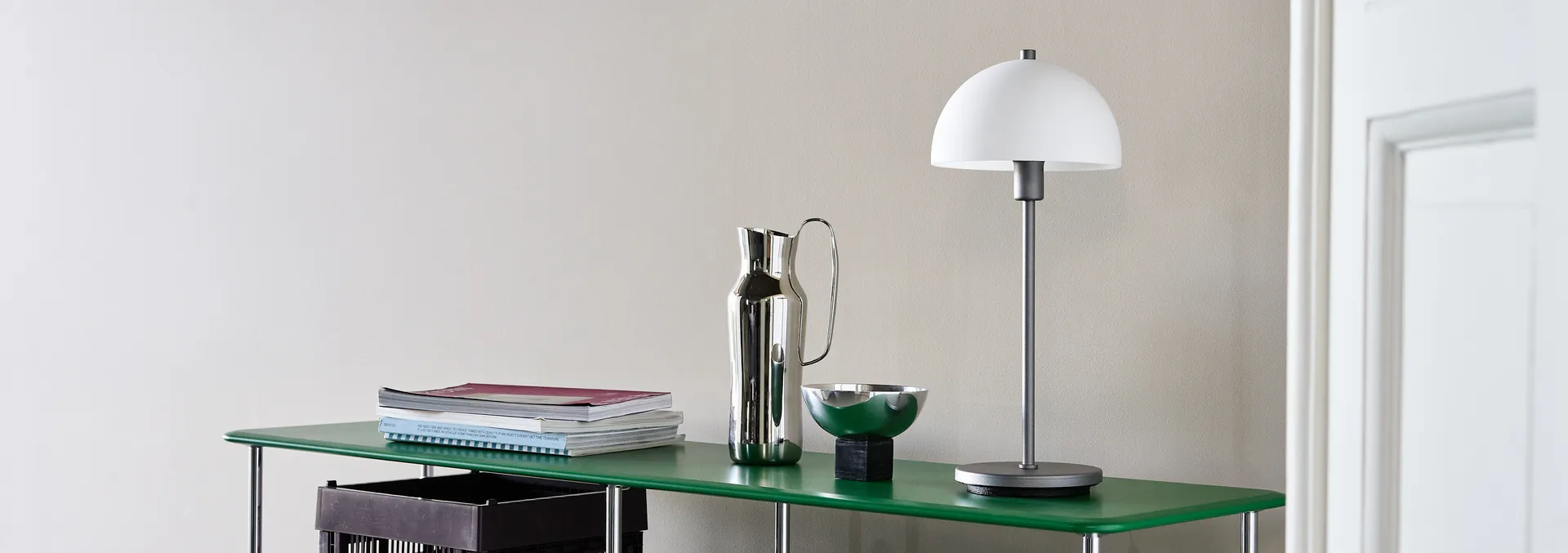 La lámpara de mesa Vienda X de la marca de iluminación danesa Herstal es un modelo más actualizado de la clásica lámpara Vienda. A diferencia de su predecesor, este modelo de lámpara tiene una base más pesada y elegante, hecha en acero oxidado con revestimiento en mate, y tiene una pantalla en vidrio opalino. La lámpara de mesa es ideal para colocar en la mesita de noche o en un aparador.