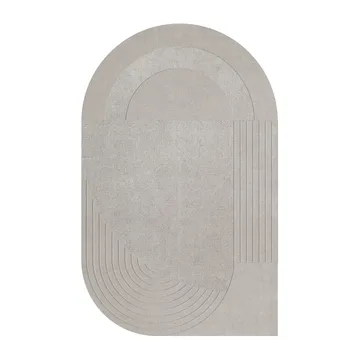 Alfombra de lana Circular 180x270 cm de la sueca Layered, confeccionada combinando distintas técnicas y estructuras, con la lana sin teñir como elemento central del diseño. Esta suave alfombra tiene una forma ovalada con una esquina a 90 grados y está tejida a mano, lo que hace que cada pieza sea única.