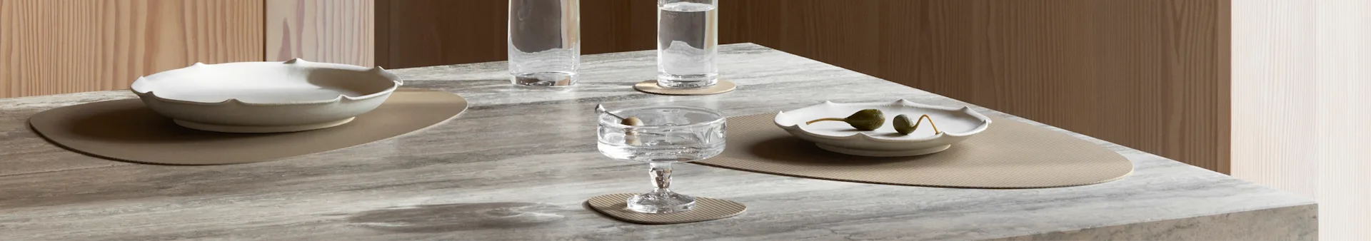 En el surtido de LIND DNA, podrás encontrar una gama de productos elegantes para la mesa y el hogar, como salvamanteles, posavasos, vajillas y más.