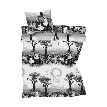 Juego de funda nórdica Mumin 150x210 cm de Moomin Arabia: un juego de cama con funda nórdica y funda de almohada confeccionado en algodón orgánico. Aporta belleza al dormitorio y duerme confortablemente en sábanas suaves decoradas con motivos del mágico mundo de los Mumin.