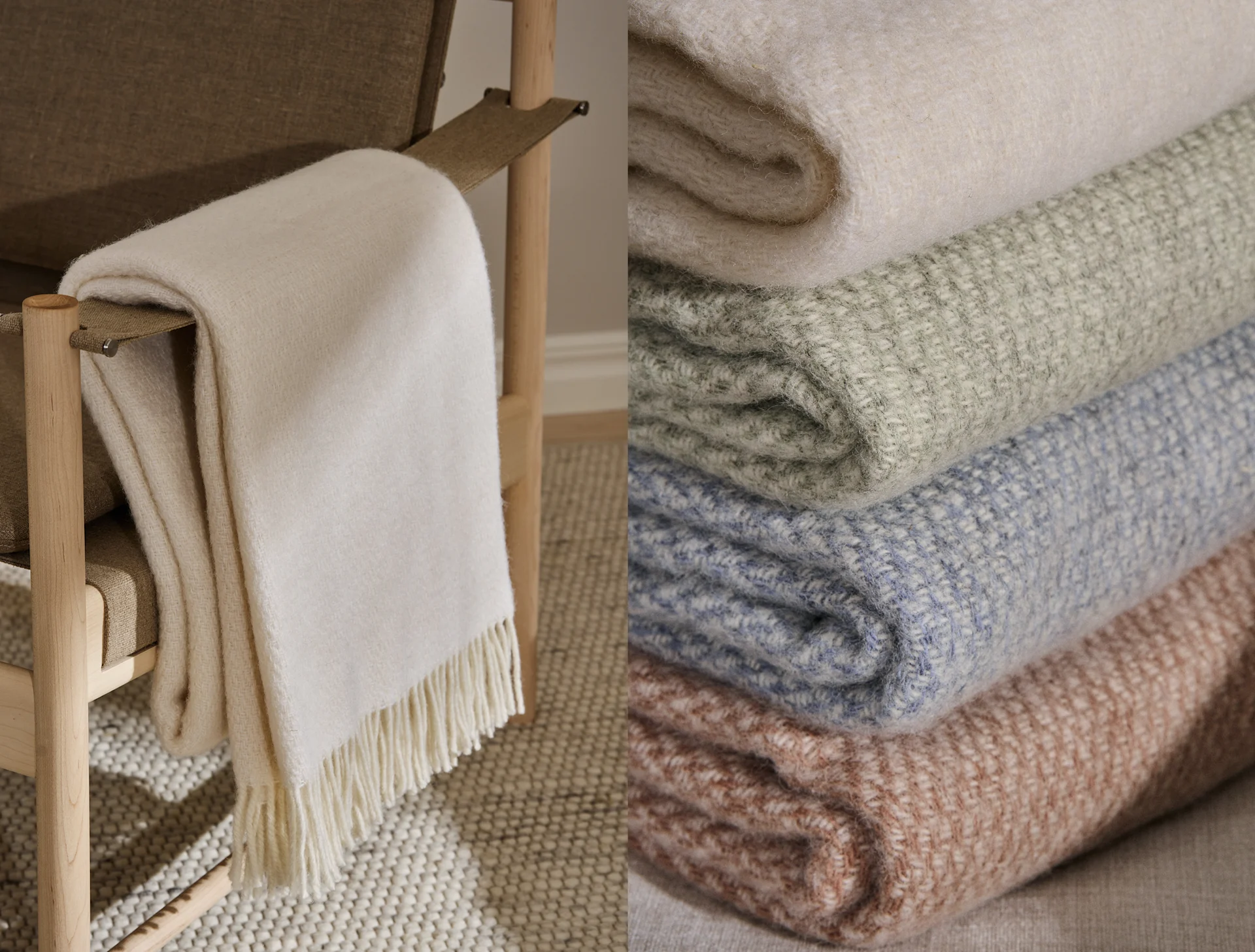 Las populares alfombras se pueden encontrar en series como Flock, con alfombras de lana tejidas a mano en materiales suaves, que también se pueden combinar con una manta de lana de la misma calidad suave.