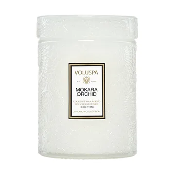 Vela perfumada en bote de cristal Japonica 50 horas es una pequeña vela aromática en tarro de cristal de Voluspa. Esta vela artesanal está elaborada con una mezcla de cera de coco libre de ftalatos, parabenos y sulfatos. El tarro con tapa presenta una hermosa superficie con relieve que convierte la vela en un elemento decorativo a la vez que difunde una fragancia agradable por el hogar.