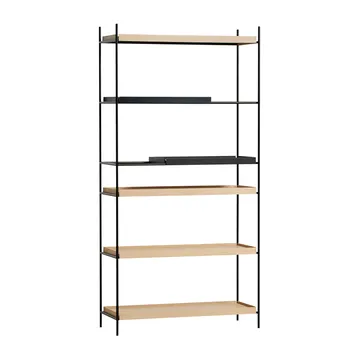 Estantería Tray alta roble, 100x201 cm de la danesa Woud es una librería abierta con seis baldas de distintos tamaños diseñada por Hanne Willmann. La estantería alta presenta una simetría estética de líneas rectas y ha sido concebida para adaptarse a tus necesidades. Elige tu combinación favorita colocando las bandejas en cualquiera de los distintos niveles del marco. Cuenta además con pequeñas baldas que permiten colocar objetos más altos, como un jarrón decorativo.