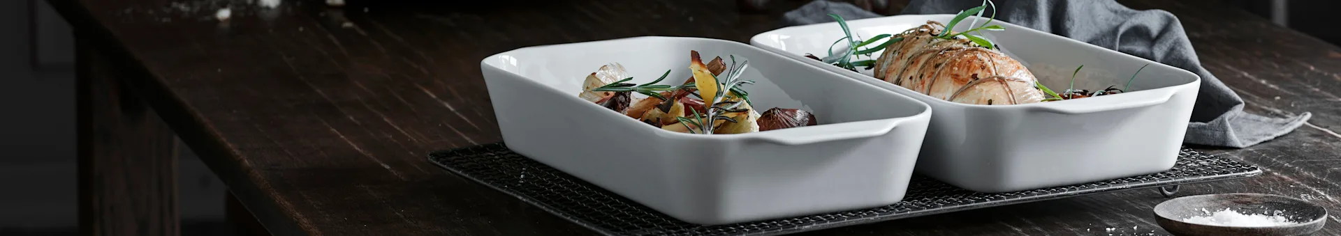 Las bandejas para asar son fuentes de horno rectangulares que son especialmente adecuados para asar y gratinar. Por lo general, están hechas de acero inoxidable o aluminio y, a menudo, tienen rejillas que permiten que el jugo o la grasa de la carne se drene. Para bandejas de calidad, echa un vistazo a las colecciones de marcas como De Buyer e Iittala.