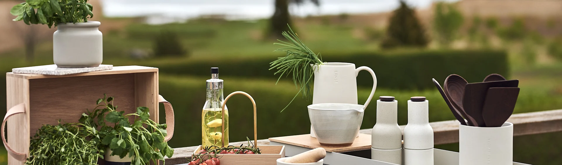 FISKARS Sartén All Steel | BROSTE COPENHAGEN Bote con tapa Nordic Sand | SERAX Utensilios de cocina Pure 5 piezas | FERM LIVING Salero con cuchara Petite 2 piezas |